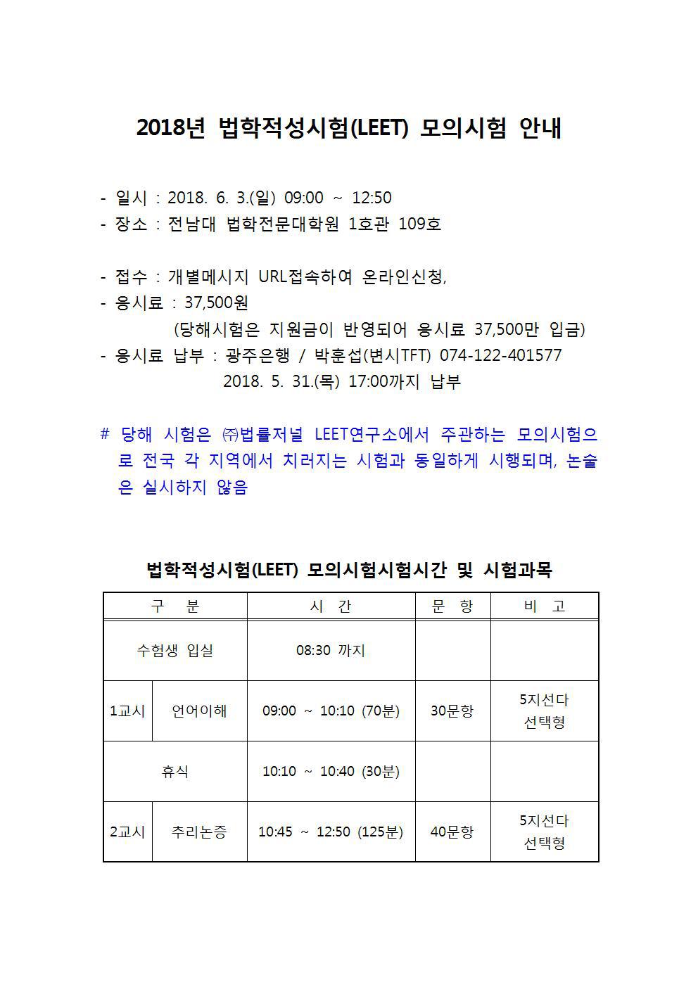 법률저널 주관 법학적성시험(LEET) 모의시험 안내 - 6. 3.(일) 작성자고시원 조교|작성시간18.05.28|조회수68 목록 댓글 0 글자크기 작게가 글자크기 크게가 다음검색 현재 게시글 추가 기능 열기 북마크 공유하기 신고 센터로 신고 댓글 댓글 0 댓글쓰기 답글쓰기 댓글 리스트