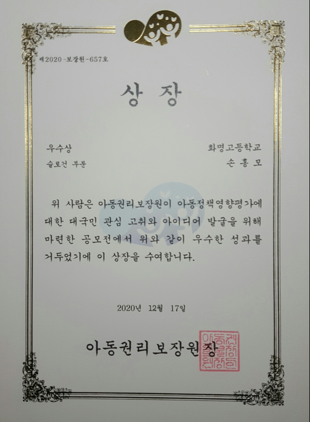 손홍모/아동정책영향평가공모전슬로건부문우수상수상(2020.12.17) 작성자쎄이영|작성시간21.02.03|조회수258 목록 댓글 0 글자크기 작게가 글자크기 크게가 수상작 : "아동을 위한 공감과 변화 새로운 전진을 위한 동행과 바램" 다음검색 현재 게시글 추가 기능 열기 북마크 공유하기 신고 센터로 신고 댓글 댓글 0 댓글쓰기 답글쓰기 댓글 리스트