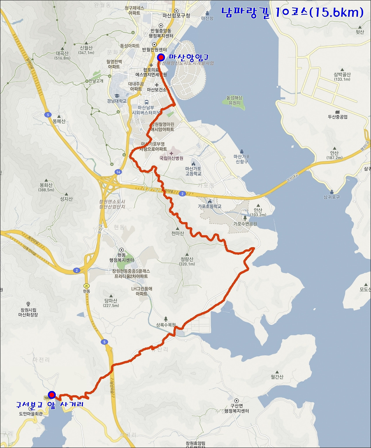 * 10코스: 마산항입구-청양산입구-유신고개-구서분교사거리 (13.2㎞)
