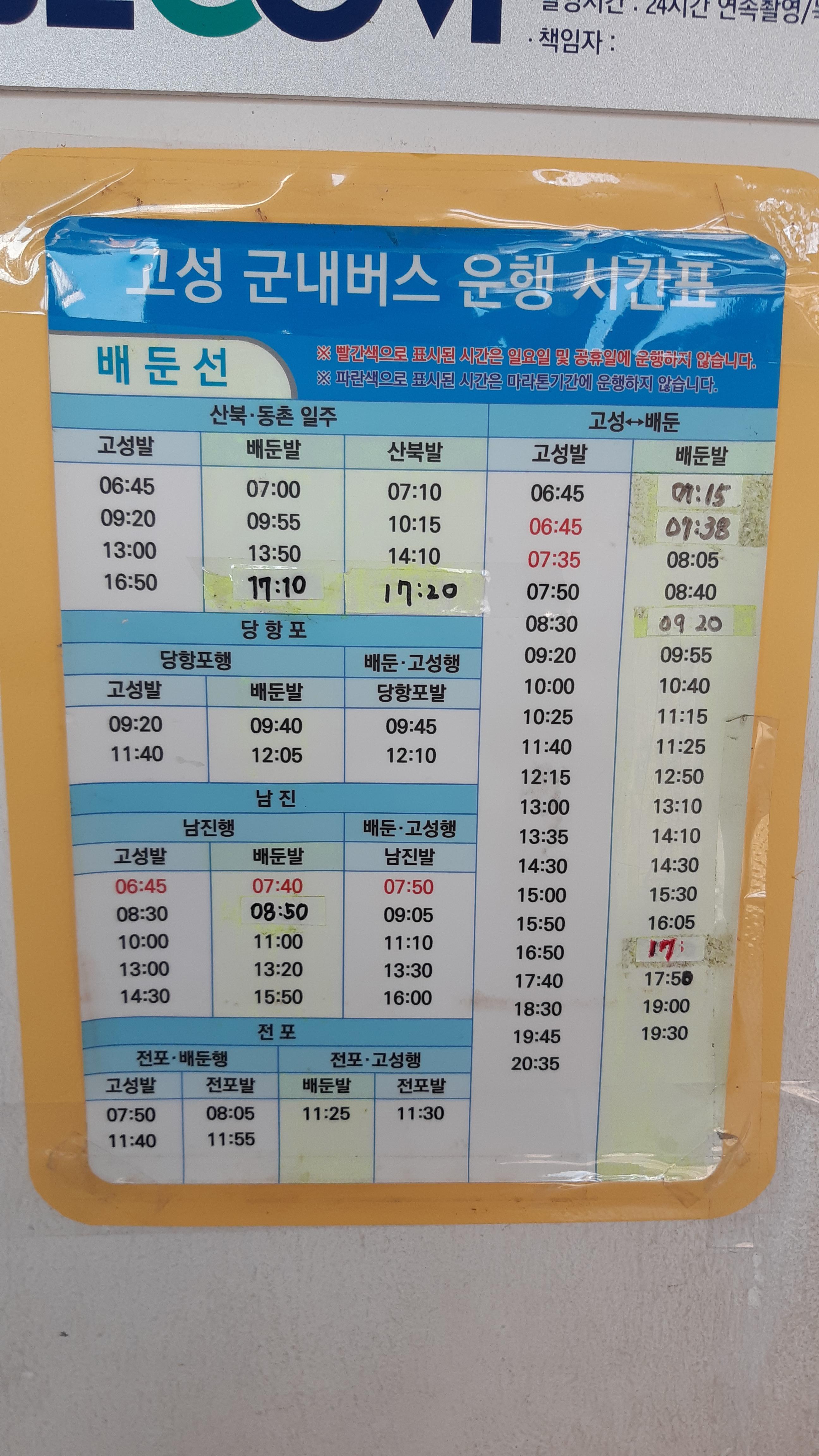 * 택시: 배둔시외버스터미널 → 고성시외버스터미널(버스 1000원: 15분소요) :대중교통 777,557,767번