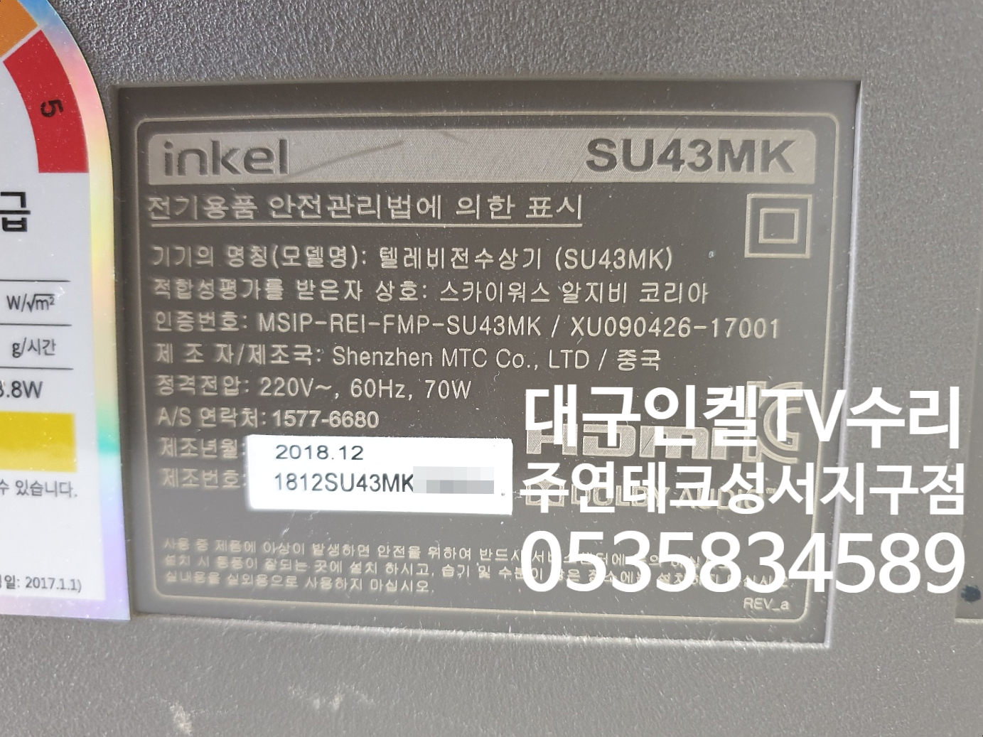 대구인켈TV고장수리/인켈SU43MK텔레비전수리/INKEL텔레비전/화면안나오는증상/TV백라이트교체수리/스카이워스 알지비 코리아