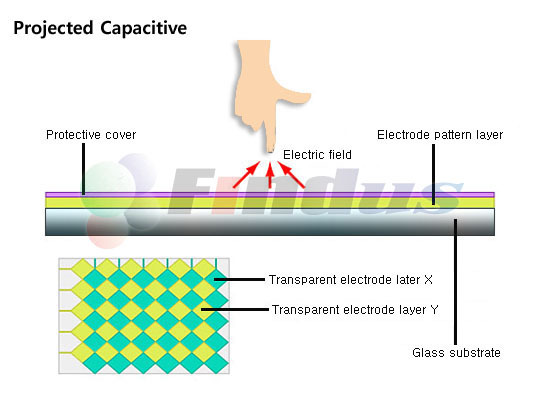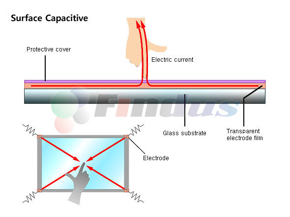 정전용량방식에는 두가지 타입의 방식이 있다. 하나는 Surface capacitive(이하 S-CAP), 다른 하나는 Projective capacitive(이하 P-CAP)이다. 두 타입의 내부적 구조는 완전히 다르다.