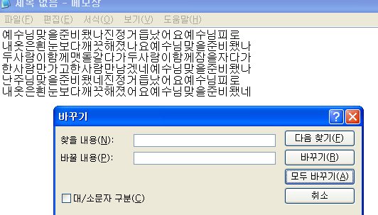 그리고 바꿀 내용에는 그대로 아무것도 없이 모두바꾸기를 하면 모두 제거됩니다.
