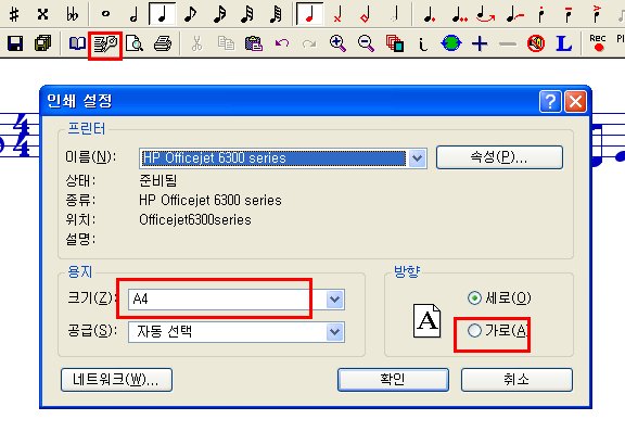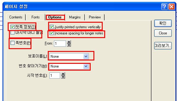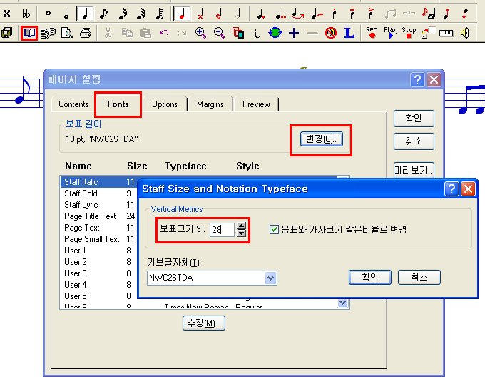 그 다음은 NWC의 페이지 설정에서 조절하시면 됩니다. 악보의 음표 크기는 28로 해 주세요