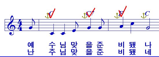 이렇게 위에 코드가 나와 있는데 파워포인트 악보에서는 거추장한것 모두 제거하고