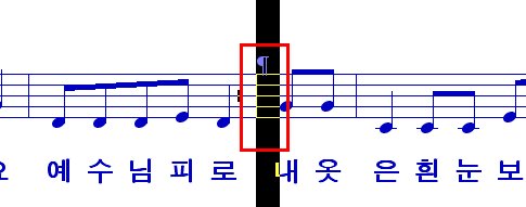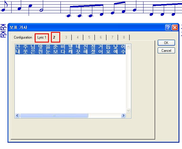 복사해 넣으면 반복되는 2절의 아래 가사는 그대로 있고 음표만 복사되어 아래 가사가 없는 상태가 됩니다.