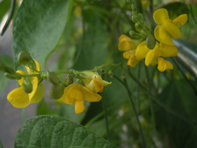 식물: 높이 30~60센티미터 되는 한해살이풀이다. 잎은 둥근 달걀 모양의 쪽잎이 3개 모인 겹잎이다. 여름철에 노란 꽃이 핀다. 열매는 내려드리운 꼬투리이다. 씨는 붉은 색이다. 각지에서 심는다.