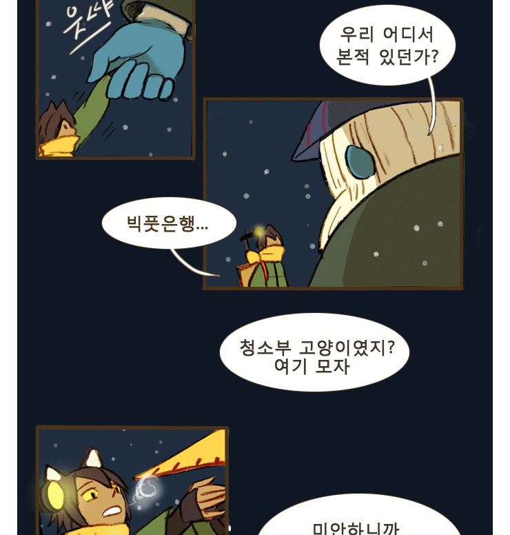 낯설고 외로운 마을에서 박수진은 고양이 이웃, 개구리 집주인, 양말도깨비들과 함께 살아가게 됩니다. 그 이야기들이 참으로 따뜻하게 진행되는 것이 이 만화의 장점이고요. 현재 다음에서 연재중인 '도깨비 언덕에 왜 왔니'를 떠오르게 하는 지점이 있습니다. 전혀 다른 형식이나 그림, 내용이긴 한데요, 뭔가 동화적인 이야기를 펼쳐지고 판타지한 인물들이 출연한다는 점에서 말이에요.