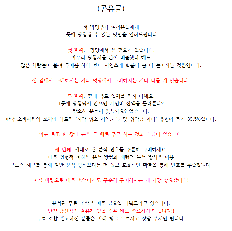 펌) 당첨자가 알려주는 당첨 비법! 작성자julyju|작성시간22.08.18|조회수34 목록 댓글 0 글자크기 작게가 글자크기 크게가 다음검색 현재 게시글 추가 기능 열기 북마크 공유하기 신고 센터로 신고 댓글 댓글 0 댓글쓰기 답글쓰기 댓글 리스트