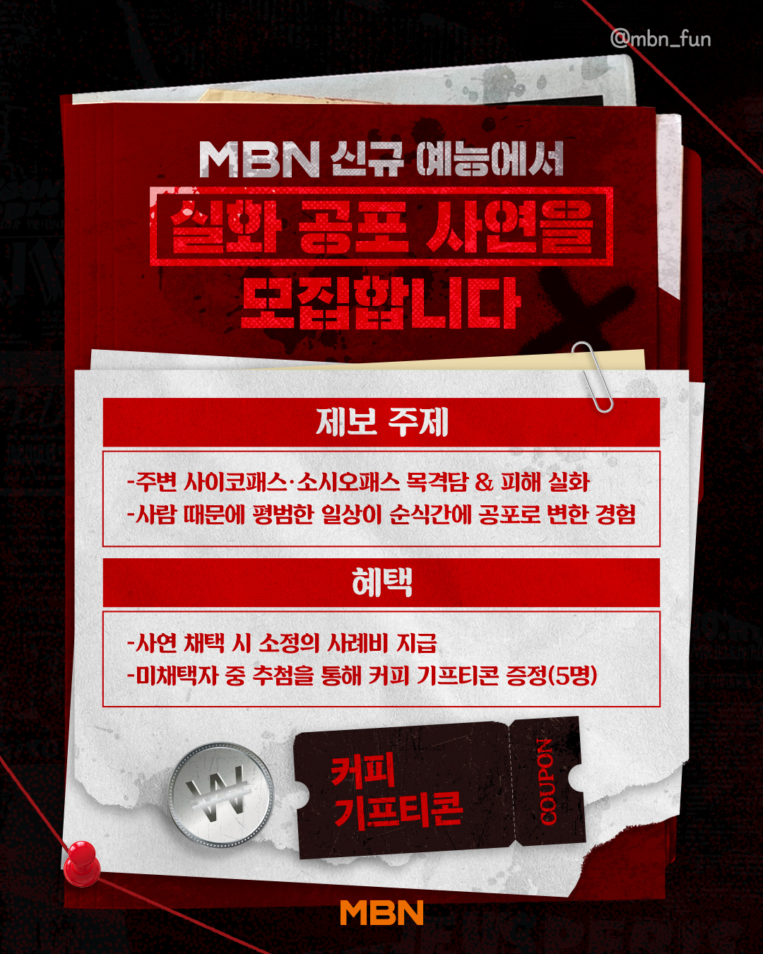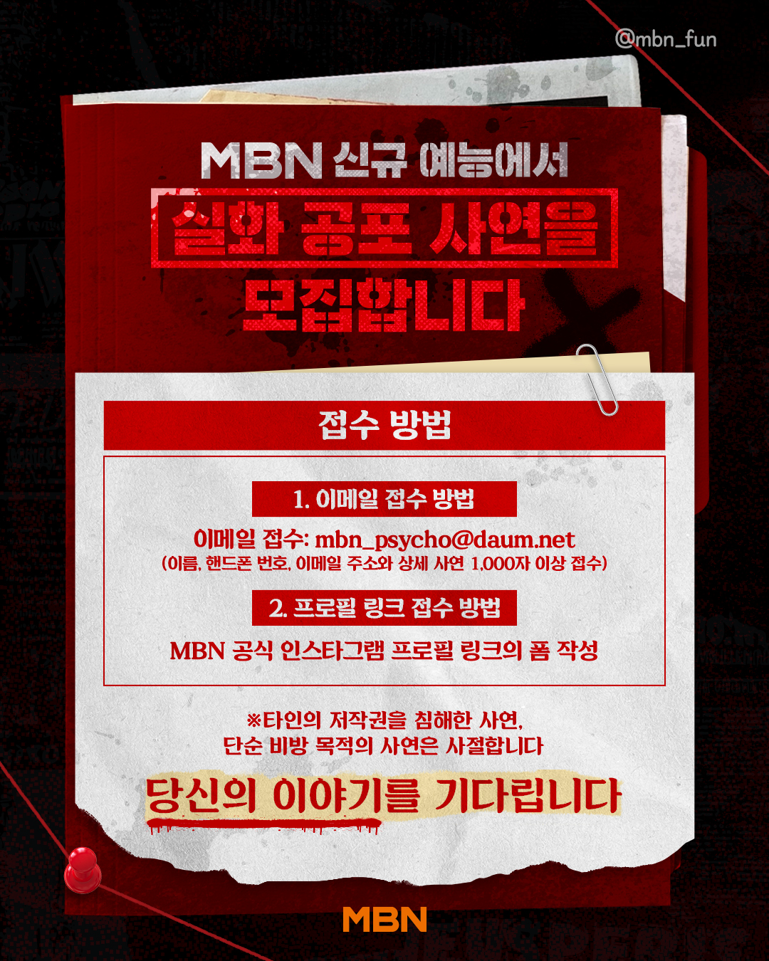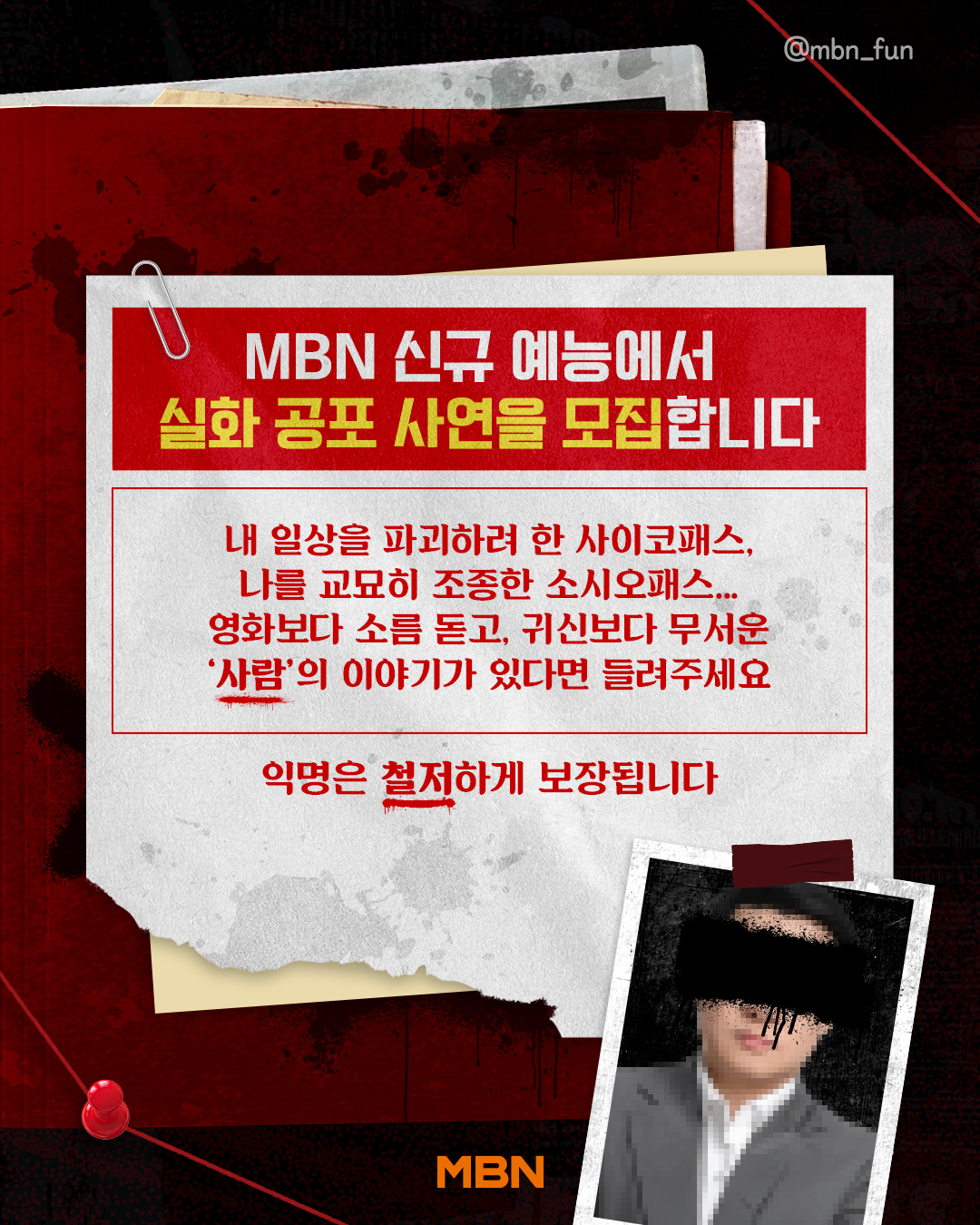 MBN <신규 재연 프로그램>에서 '실화 공포 사연'을 모집합니다 작성자내만사|작성시간26.04.09|조회수2 목록 댓글 0 글자크기 작게가 글자크기 크게가 https://docs.google.com/forms/d/e/1FAIpQLSd5W3hCoj6rukOiyejjAXASSio1SC3T6MEWCxvrWYs4H8zzhw/viewform 다음검색 현재 게시글 추가 기능 열기 북마크 공유하기 신고 센터로 신고 댓글 댓글 0 댓글쓰기 답글쓰기 댓글 리스트