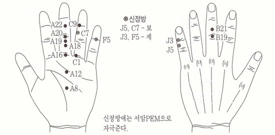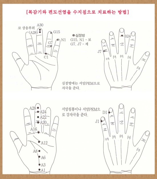 코 감기는 코 알레르기 처방대로 하면 낫는다. 문제는 목감기인데 목감기 중에서 가장 고통스러운 것이 편도선염이다. 편도선 염증이 심하면 목이 아프고 고열이 나면서 전신에 관절통. 근육통이 나타나고 음식을 삼킬수 없을 정도가 된다. 이때는 J1, D1과 편도선 상응점을 서암침봉이나 서암PEM으로 강자극을 준다. 편도선 상응점은 가운뎃손가락 중간 마디의 어느 한점, 압진기로 눌러 가장 아픈 지점이다.