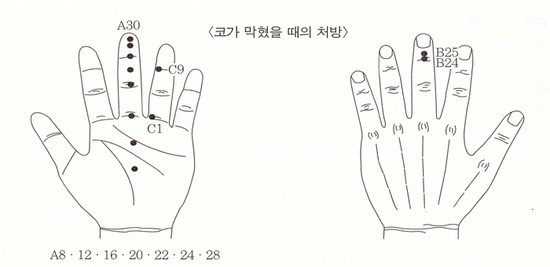 화를 벌컥 낸다든가 흥분된다든가 과음을 한다든가 신경을 쓰면 콧속에서 막힘 현상이 일어나 씩씩 거리면서 숨을 쉬게 된다. 이런 때는 진정을 하면 곧 없어지지만 습관적으로 자주 발생하는 경우에는 평상시에도 코막힘 증상이 일어난다. 뿐만 아니라 단전호흡을 할 때에도 숨을 서서히 내쉬기 위해 기관지를 수축 조절하다 보면 만성화되어 항상 코막힘이 일어나게 된다. 간단한 코막힘은 잘 치료가 되나 만성화된 것은 평상시에도 코막힘 증상이 있어서 호흡이 곤란하다. 코막힘은 양쪽이 다 있는 경우도 있고 한쪽에만 나타나는 경우도 있다. 간단한 경우는 A28. 30, B24번에 서암침봉이나 서암PEM으로 치료하여도 잘 낫는다. 또는 가운뎃손가락에 항상 골무지압구를 끼고 자극을 주어도 잘 낫는다. 만성 고질화된 것은 상응치료를 해야된다. A8. 12. 16. 20. 22. 24. 28과 C1. 9,B24. 25와 코 상응점에 서암침봉이나 서암PEM으로 시술을 한다.