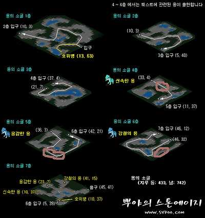 용의 동굴의 지도. 4층에서 신속, 5층에서 용감, 6층에서 강철의 용을 잡아 여의주를 얻어야 한다.