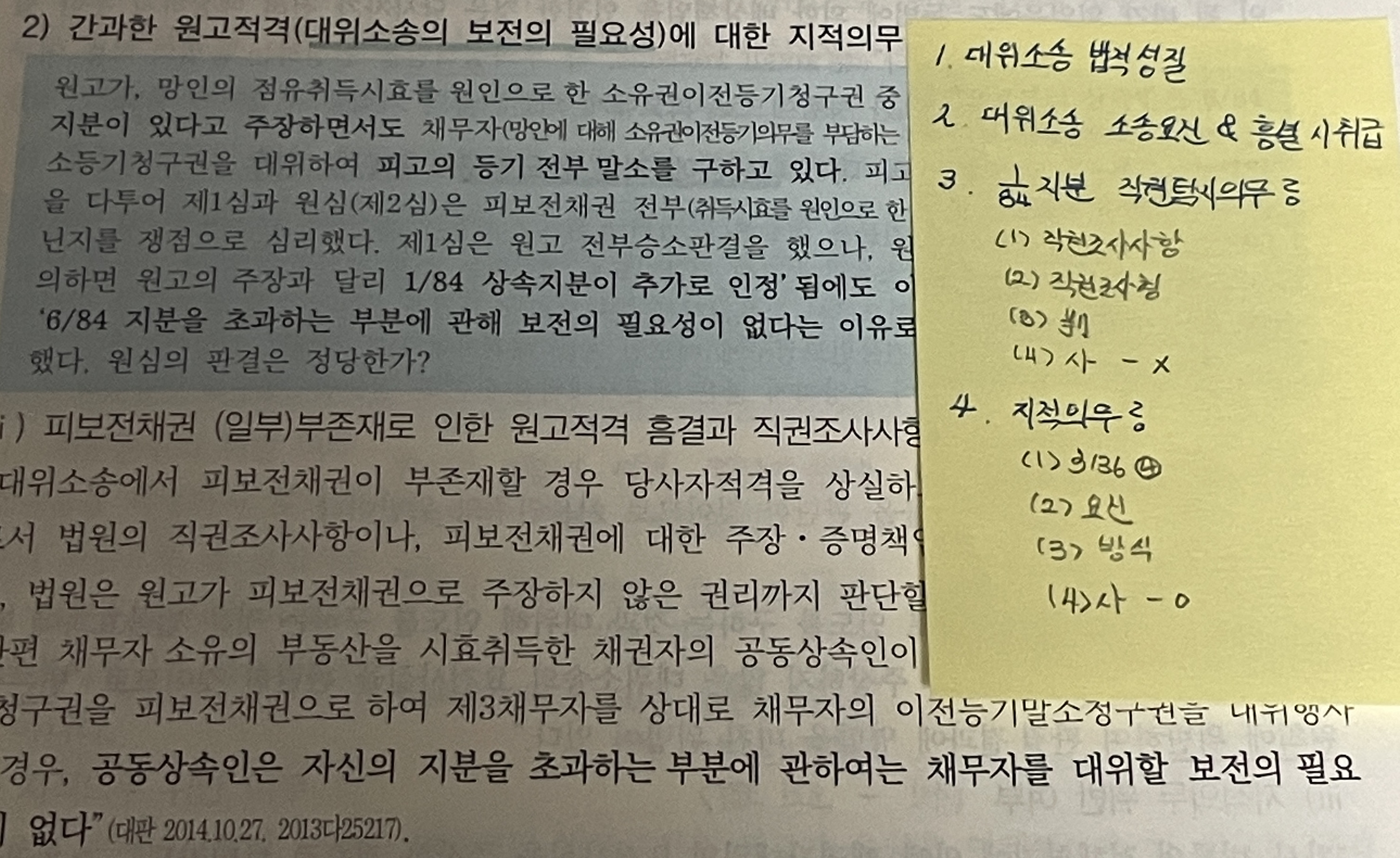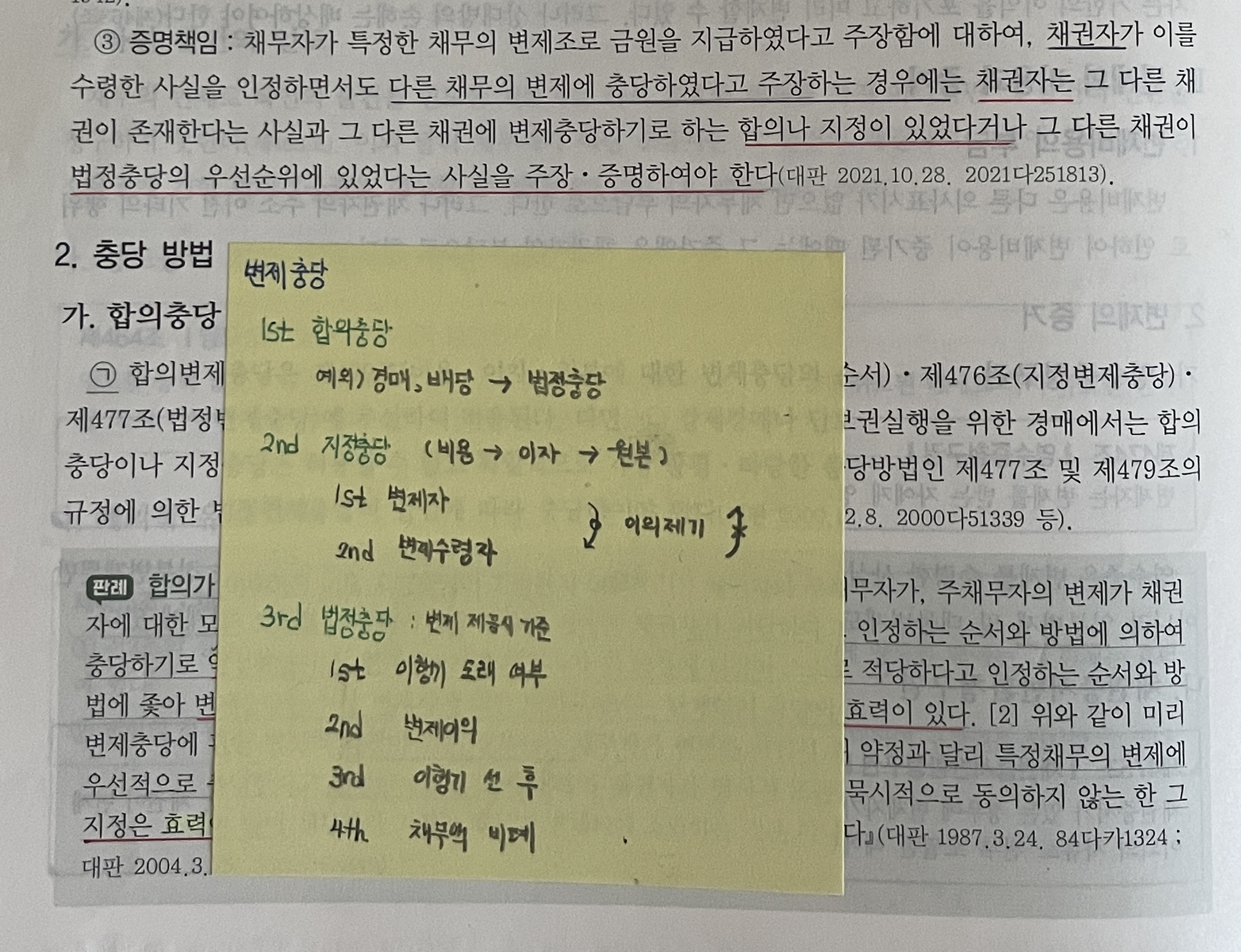 키워드에만 밑줄을 쳤습니다. 판례는 빨간색, 학설은 파란색, 검토는 초록색으로 밑줄 쳤습니다.