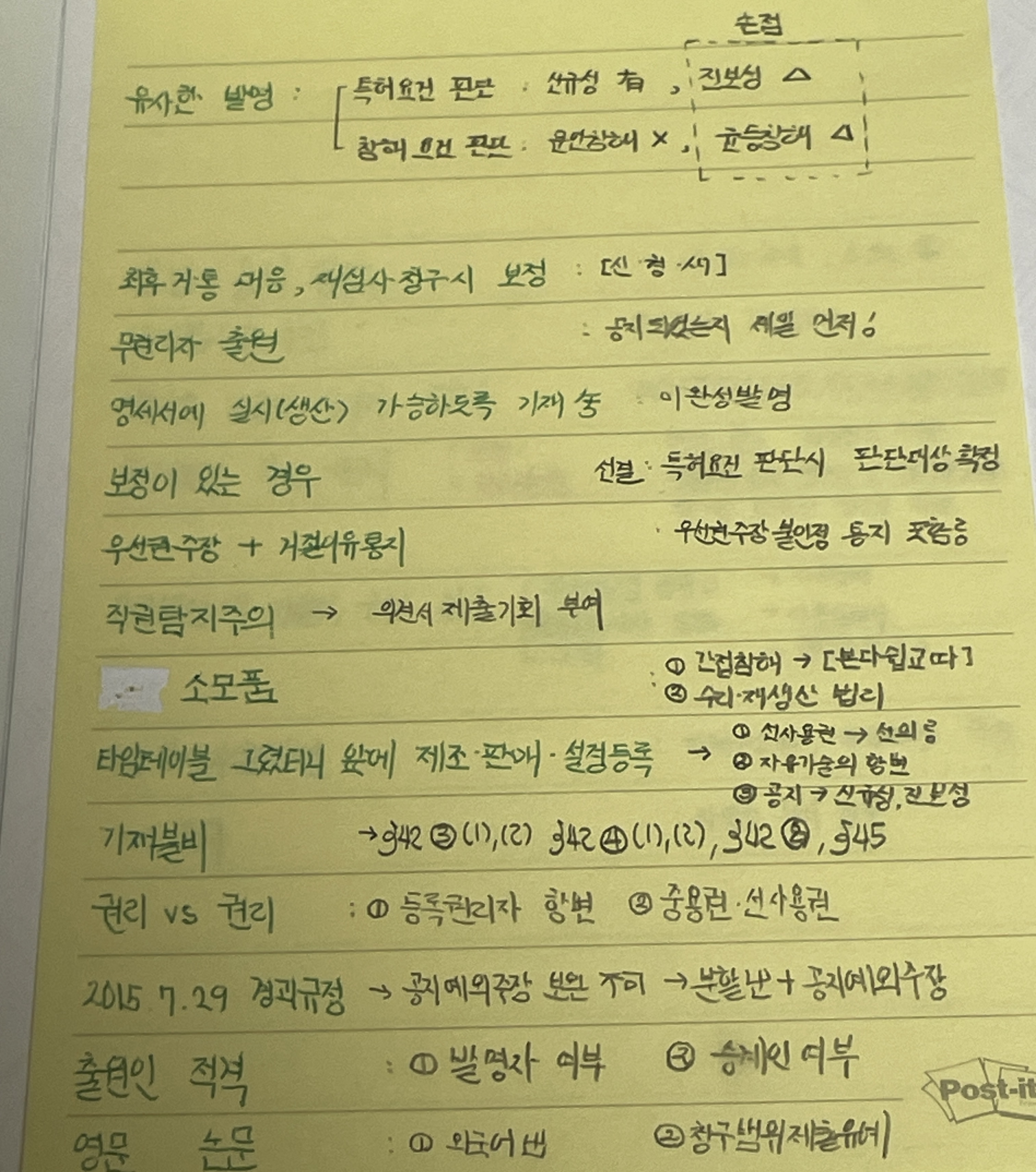 박형준 변리사님이 시험 직전 기초 GS 카톡방에 올려주신 조언을 되뇌며 시험에 들어갔습니다. 요약하자면 시간, 배점에 유의할 것 / 모르는 문제는 기회로 생각할 것 / 아는 문제는 변형에 유의할 것이었습니다.