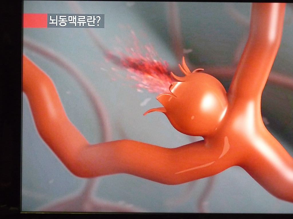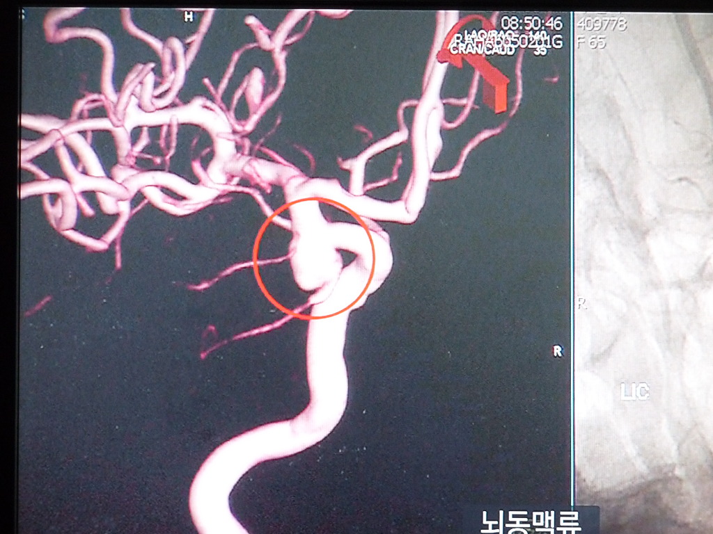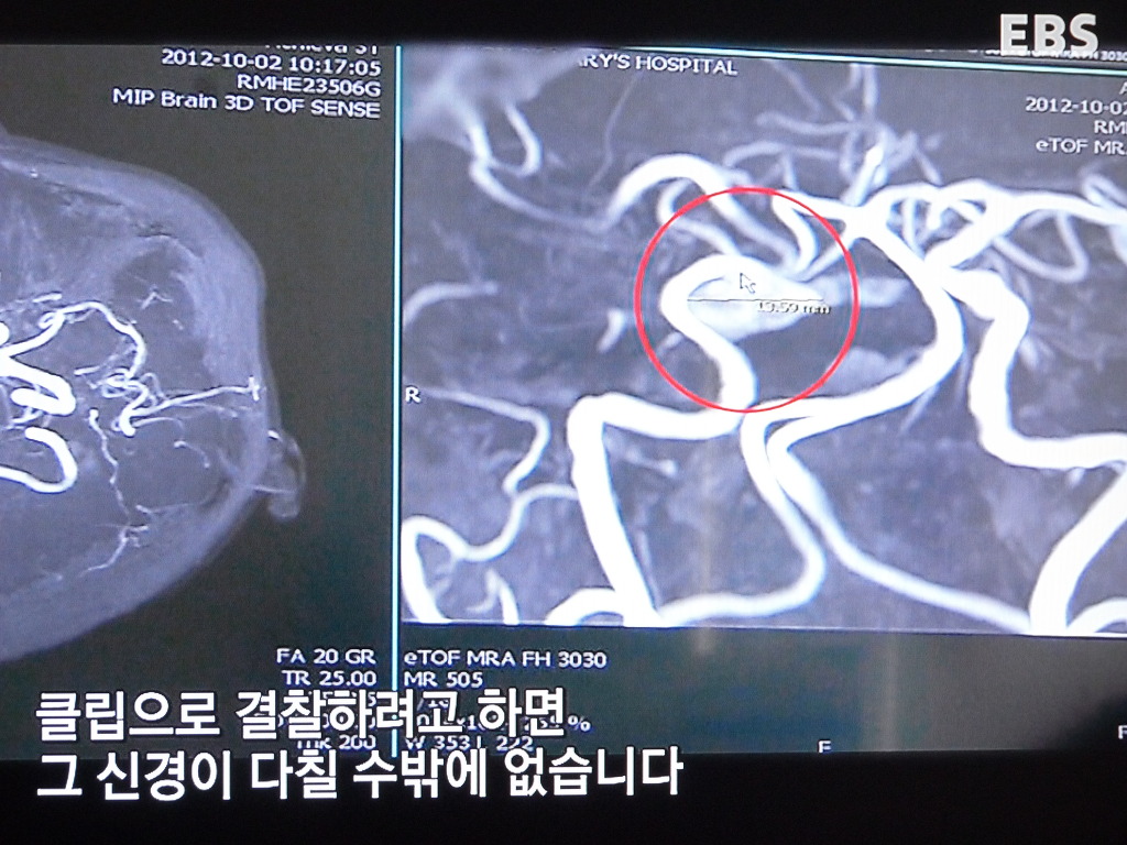 현대인의 몸 속 시한폭탄이 되는 뇌동맥류는 평소에는 아무런 자각 증상이 없다가 갑자기 뒷목이 뻐근해지며 머리가 터지는듯한 고통을 호소하며 뇌신경을 눌러 한쪽 눈꺼풀이 내려 앉고 동공이 확장되고 마비 증세가 나타난다.