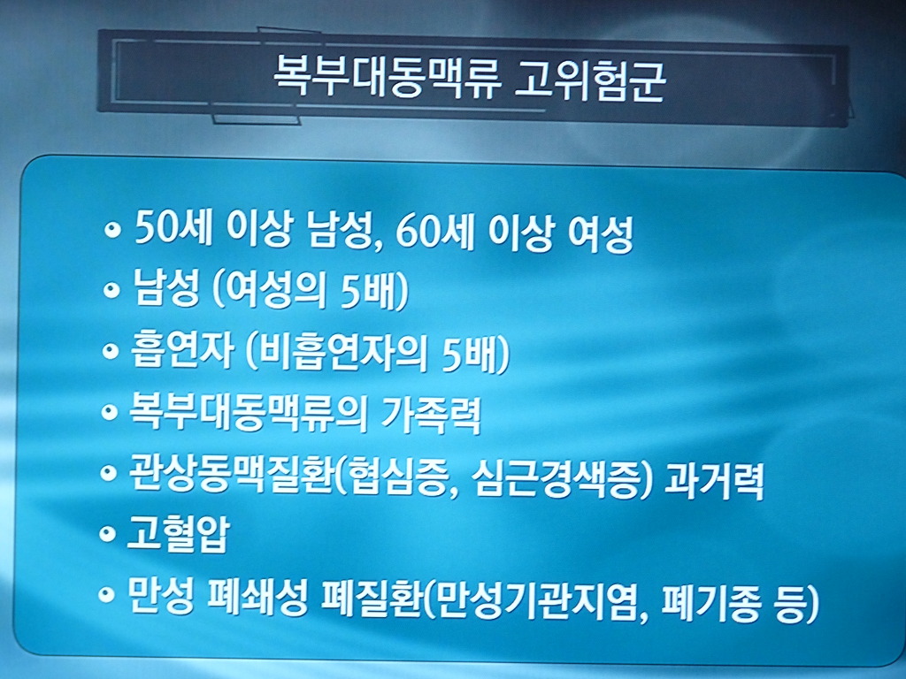 복부동맥류가 파열되면 30-40%의 환자가 사망하는 대단히 위험한 질환으로 복부대동맥류의 경우에는 대동맥의 지름이 5cm 이상 부풀어 있으면 치료가 필요하다. 복부대동맥류가 있는 경우 환자는 심장이 배속에 있는 듯한 펄떡이는 현상이나 소화가 안되고 배곱 근처에 동그란 것이 만져지는 현상이 있다.