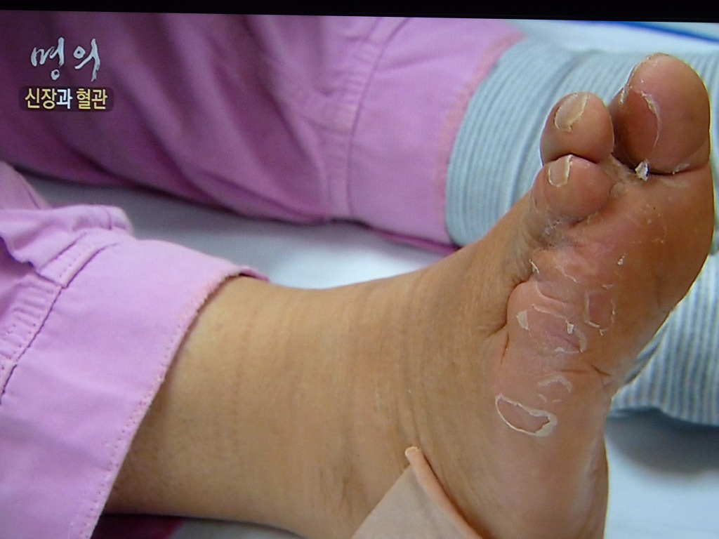 신장병이 오면 먼저 왼쪽 발에 염증이 생기게 되고 발 길이가 같지 않게 되며 얼굴과 손발이 붓는다.