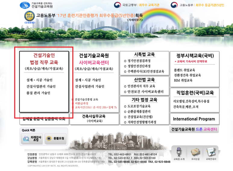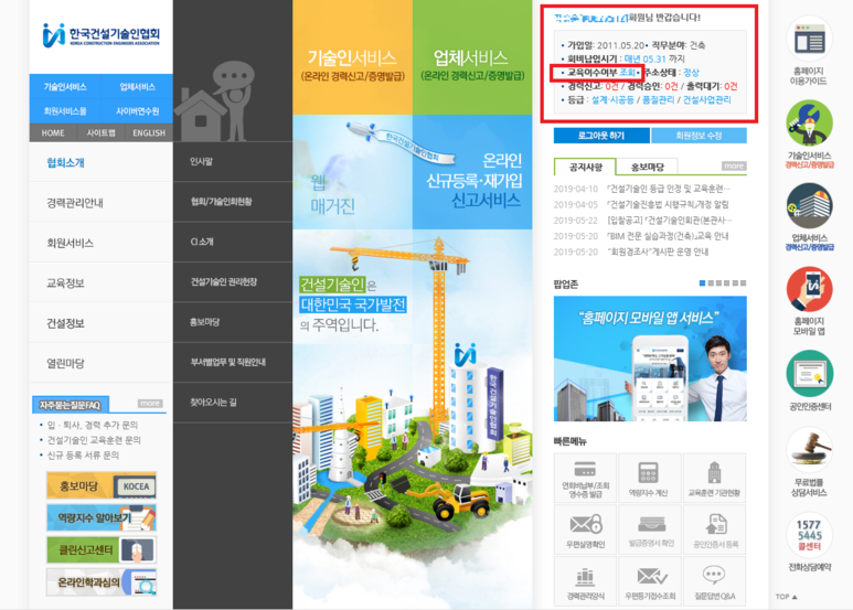 건설기술인협회 최초교육 / 승급교육 / 계속교육 작성자The.|작성시간19.05.27|조회수2,651 목록 댓글 0 글자크기 작게가 글자크기 크게가 ↓↓↓ 한국건설인협회 바로가기 ↓↓↓http://www.kocea.or.kr/↓↓↓ 교육이수여부 조회 바로가기 ↓↓↓https://homenet.kocea.or.kr:1443/home/index.do ↓↓↓ 교육신청 바로가기 ↓↓↓http://www.kicte.or.kr/ 다음검색 현재 게시글 추가 기능 열기 북마크 공유하기 신고 센터로 신고 댓글 댓글 0 댓글쓰기 답글쓰기 댓글 리스트