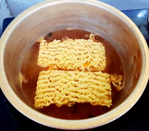 1) 평소 라면을 끓일 때보다 물은 3/2만 넣고 수프도 3/2만 넣어 강한 불로 끓이기 시작합니다.
