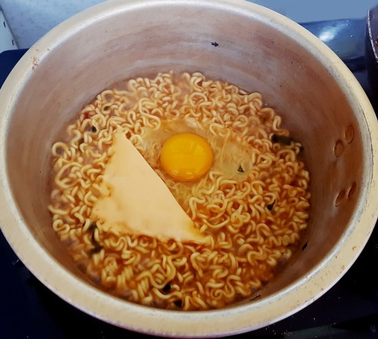 3) 그리고 면이 다 익어갈 때쯤 달걀 한 개와 치즈를 올려주고 뚜껑을 닫아 1분간 졸여주세요.