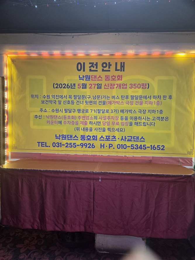 4월 19일까지 영업을 하고 5월 27일에 새로운 자리에서 충분한 시설로 사즐모 회원과 모든 댄스 동호인의