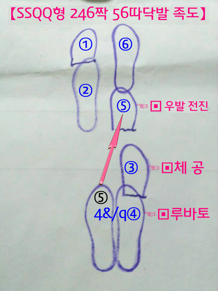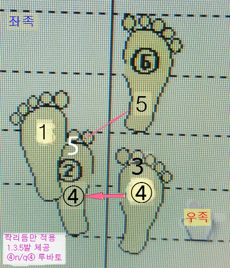 이때 좌5발 스텝을 우5발로 이동하여 우6번 발에다가 꿔줘서