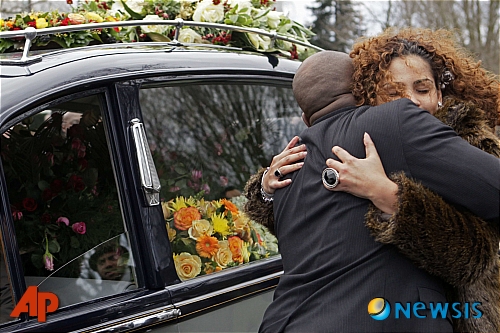 ▲... 【암스테르담(네덜란드)=AP/뉴시스】지난 12월 30일(이하 현지시간) 러시아 상트페테르부르크의 한 호텔에서 심장마비로 숨진 그룹 보니엠의 바비 패럴(61)의 장례식이 8일 네덜란드 암스테르담에서 열린 가운데 그의 딸 자닐라 패럴이 조문객의 위로를 받고 있다.