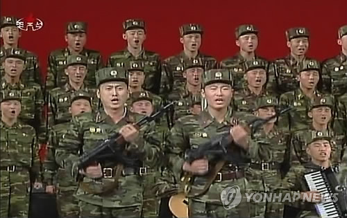 ▲... (서울 조선중앙TV=연합뉴스) 조선중앙TV가 8일 국군과 비슷한 얼룩무늬 군복을 입고 있는 북한군의 모습을 방영했다. 사진은 군무자 예술축전에 참가한 최혁철 소속구분대 병사들이 '승리의 열병식'을 합창하는 모습.2011.1.9