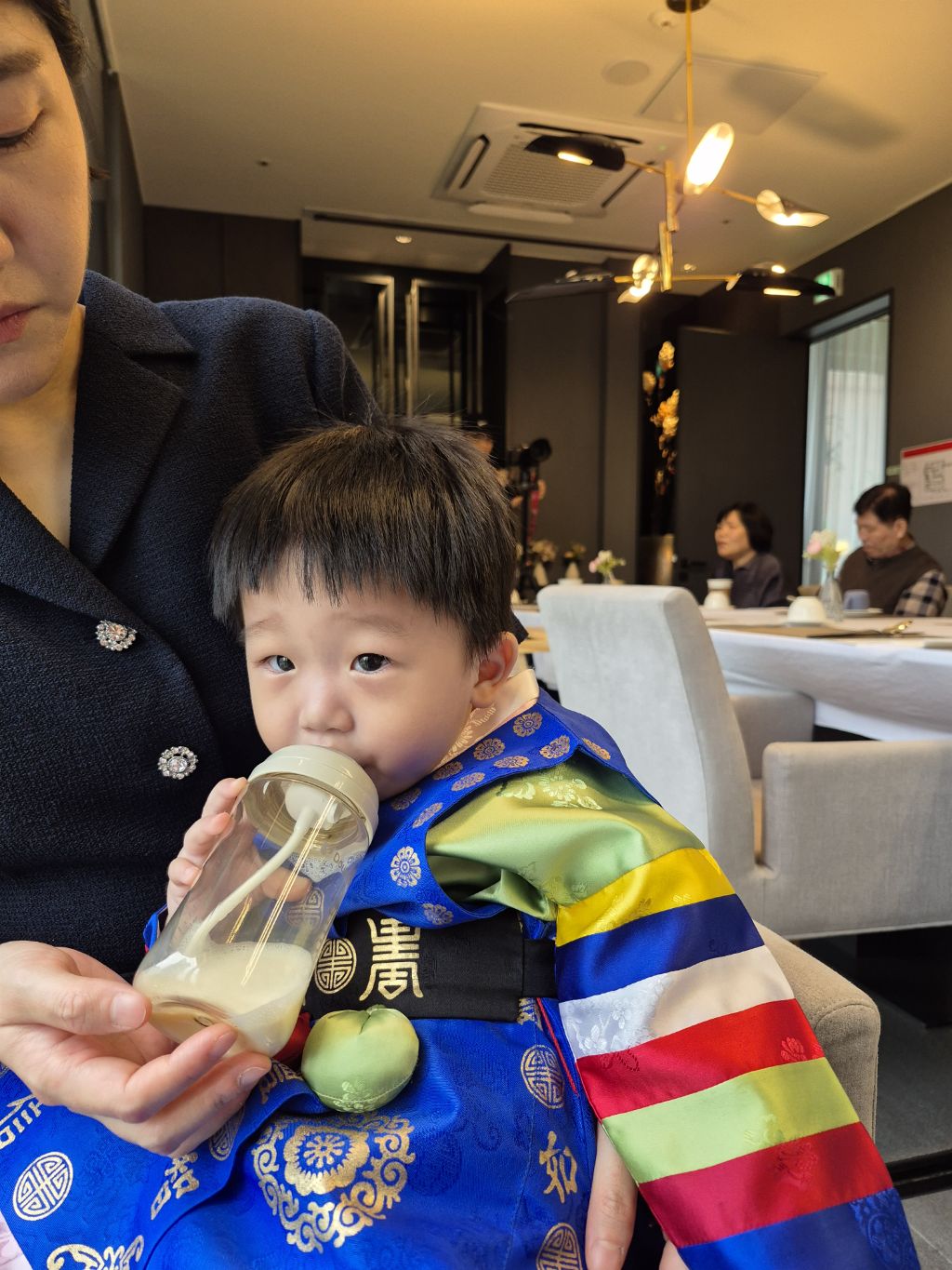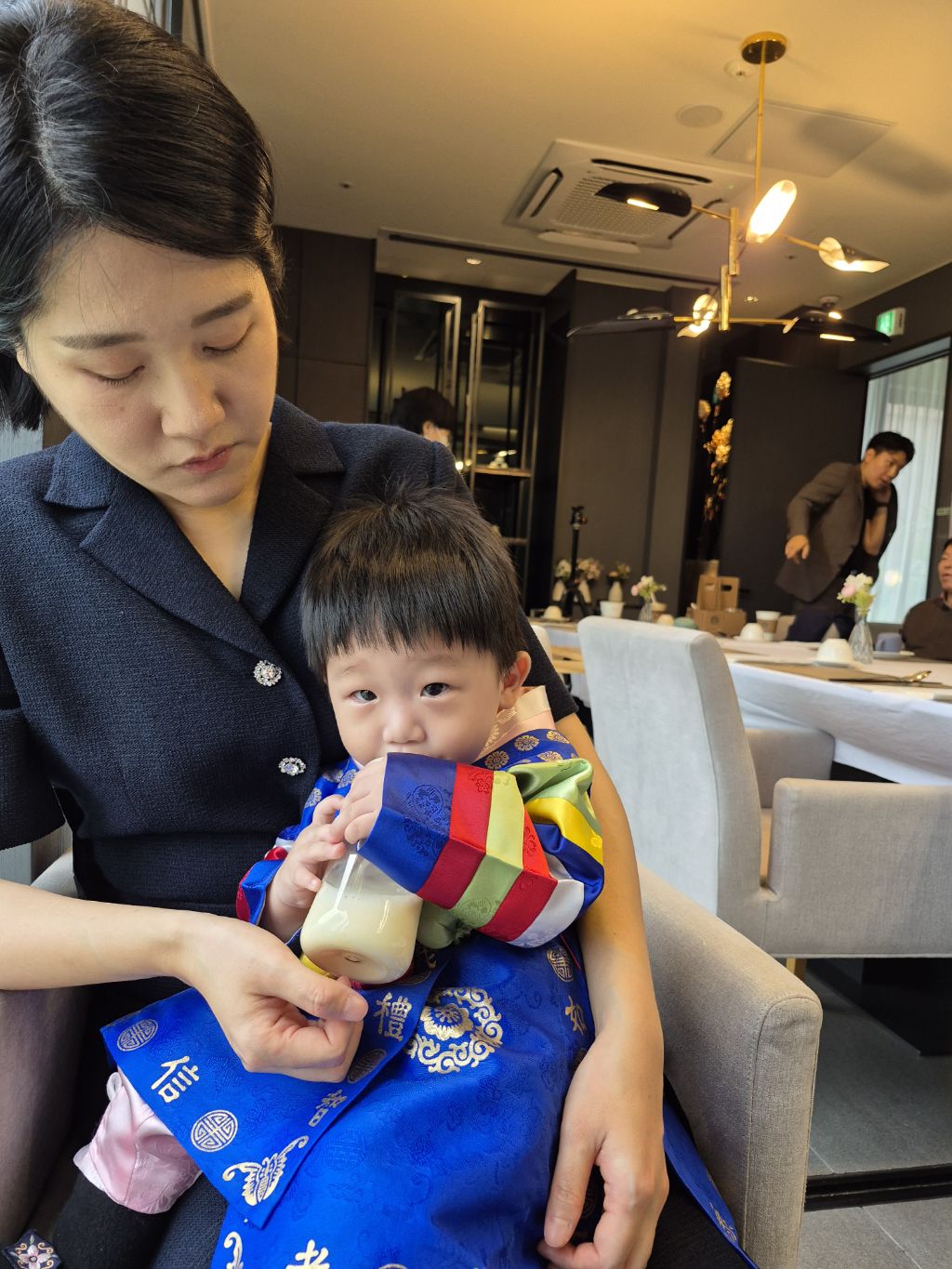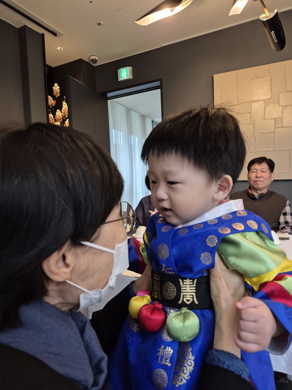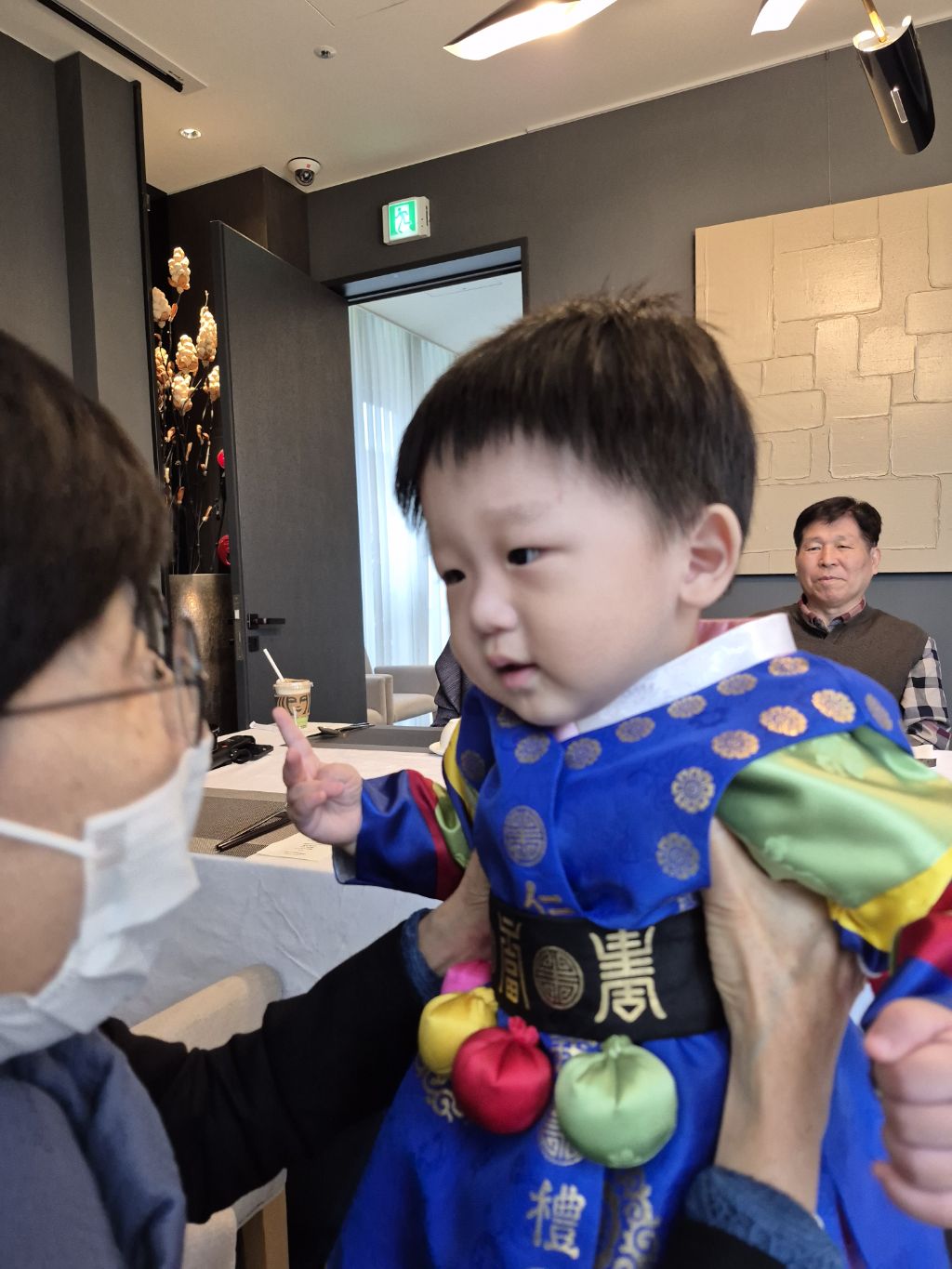 도건이 정빈이는 한복으로 갈아 입히고 있어 연회실에는 외할아버지와 사진사만 있었다.