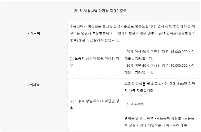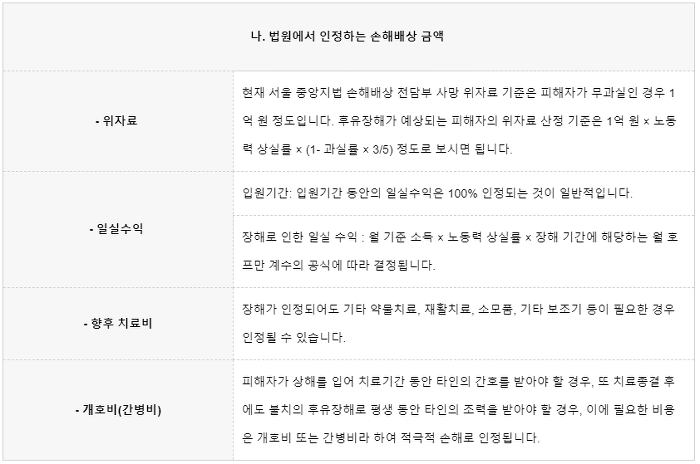 다음은 보험사 약관 따르는 지급기준액과 법원에서 인정하는 손해배상 금액입니다.