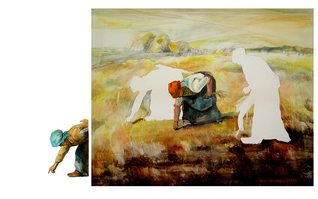 이순구, <이삭줍기>, 캔바스위에 연필, 수채물감, 아크릴, 2005