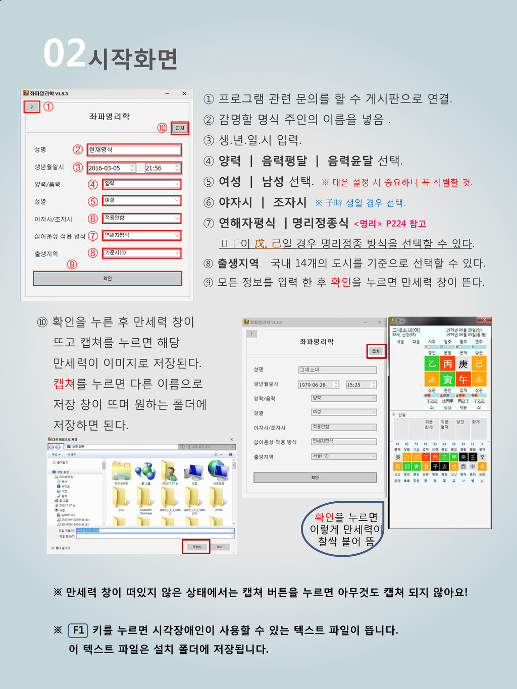 ※ <좌파명리학> 만세력 PC프로그램 사용시 F1 키를 누르시면 시각장애인분들께서 사용 할 수 있는 텍스트가 제공되니