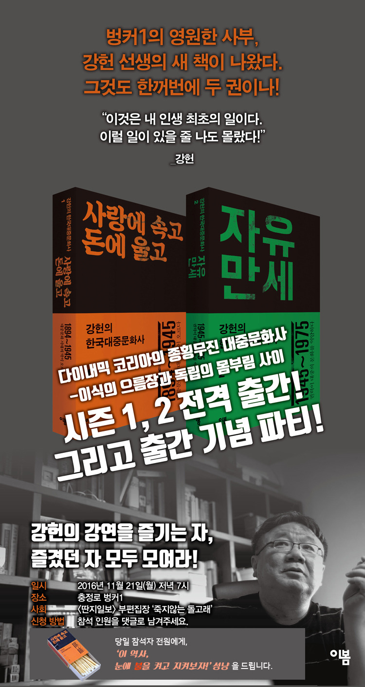 [벙커1] '강헌의 한국대중문화사' 1-2권 출간 기념 북콘서트 작성자쿨피스|작성시간16.11.10|조회수420 목록 댓글 0 글자크기 작게가 글자크기 크게가 북콘서트 신청 [BUNKER1] 바로가기알라딘 바로가기인터파크 바로가기교보문고 바로가기YES 24 바로가기(벙커1에서 주관하는 행사로 해당 카페에서는 신청이 되지 않습니다. 링크를 따라가시어 신청하시면 됩니다^^) 다음검색 현재 게시글 추가 기능 열기 북마크 공유하기 신고 센터로 신고 댓글 댓글 0 댓글쓰기 답글쓰기 댓글 리스트