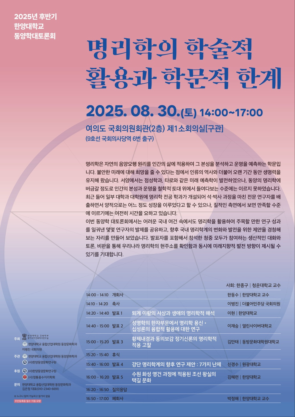 2025 한양대학교 동양학대토론회-명리학 작성자gkstkfkd|작성시간25.08.09|조회수52 목록 댓글 0 글자크기 작게가 글자크기 크게가 일시 : 2025. 8. 30(토) 14:00-18:00장소 : 여의도 국회의원회관 제1소회의실(구관) 9호선 국회의사당역 6번출구대상 : 누구나 참여할 수 있으며 참가비 없음.신분증 지참 필수 다음검색 현재 게시글 추가 기능 열기 북마크 공유하기 신고 센터로 신고 댓글 댓글 0 댓글쓰기 답글쓰기 댓글 리스트