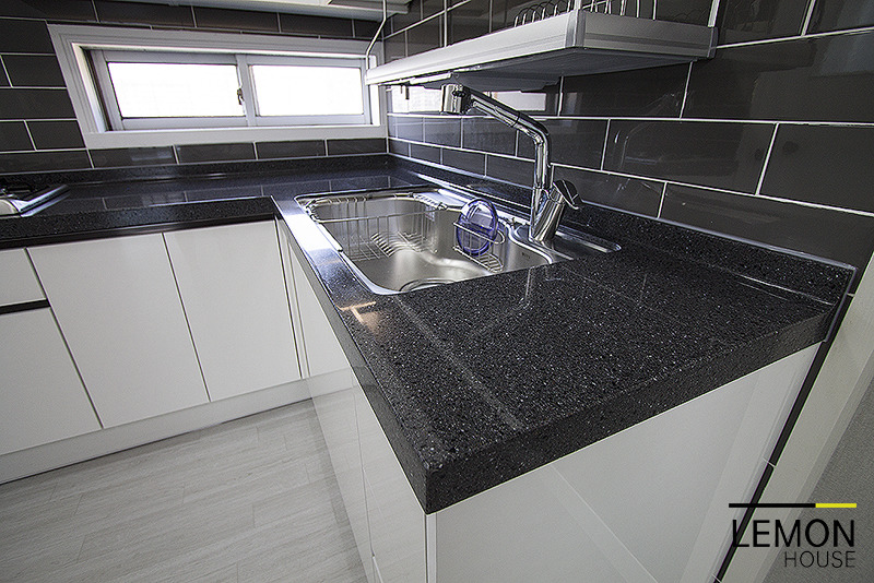 화이트상하부장에 그레이오닉스 대리석을 시공했습니다