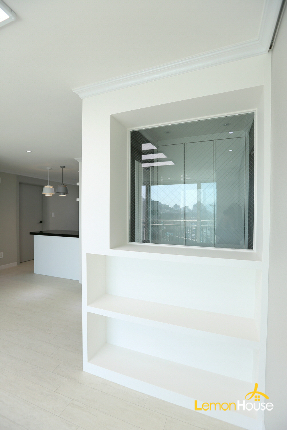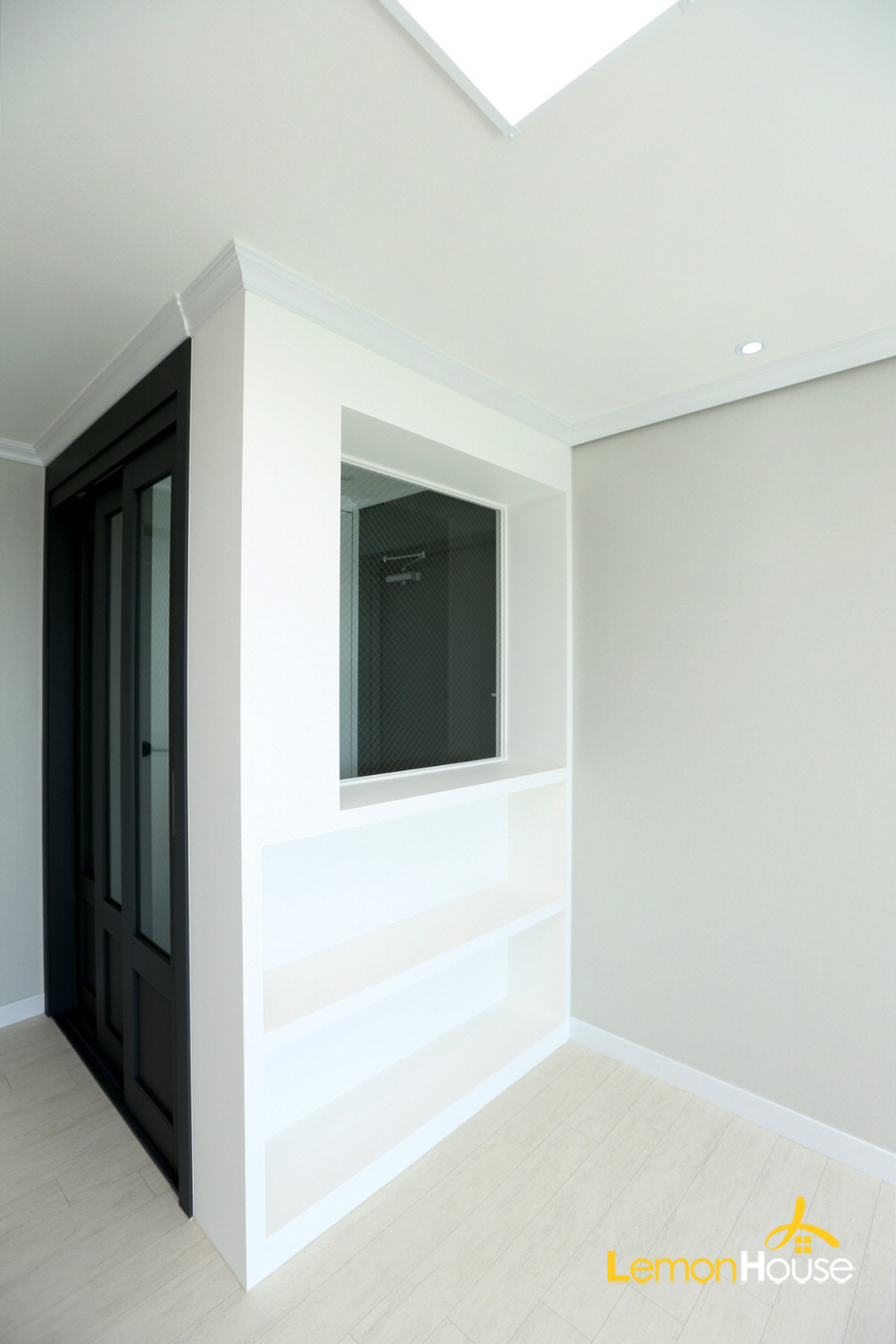 현관파티션 뒷편에는 매립형 선반을 진행해드려 수납 효과를 높여드렸습니다.