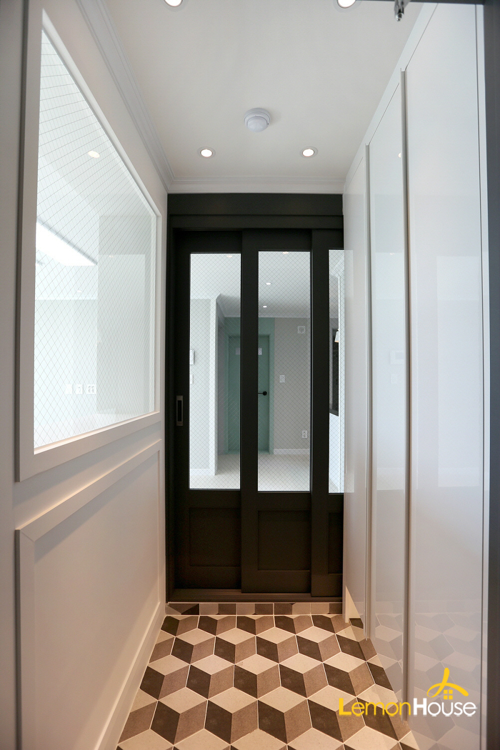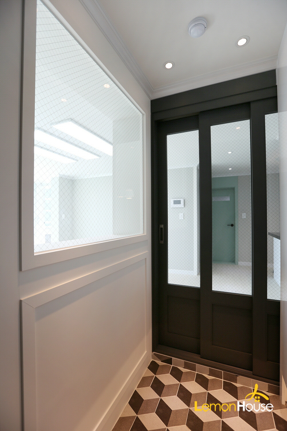 현관 파티션을 세운 뒤 3연동 중문을 설치해드렸습니다.