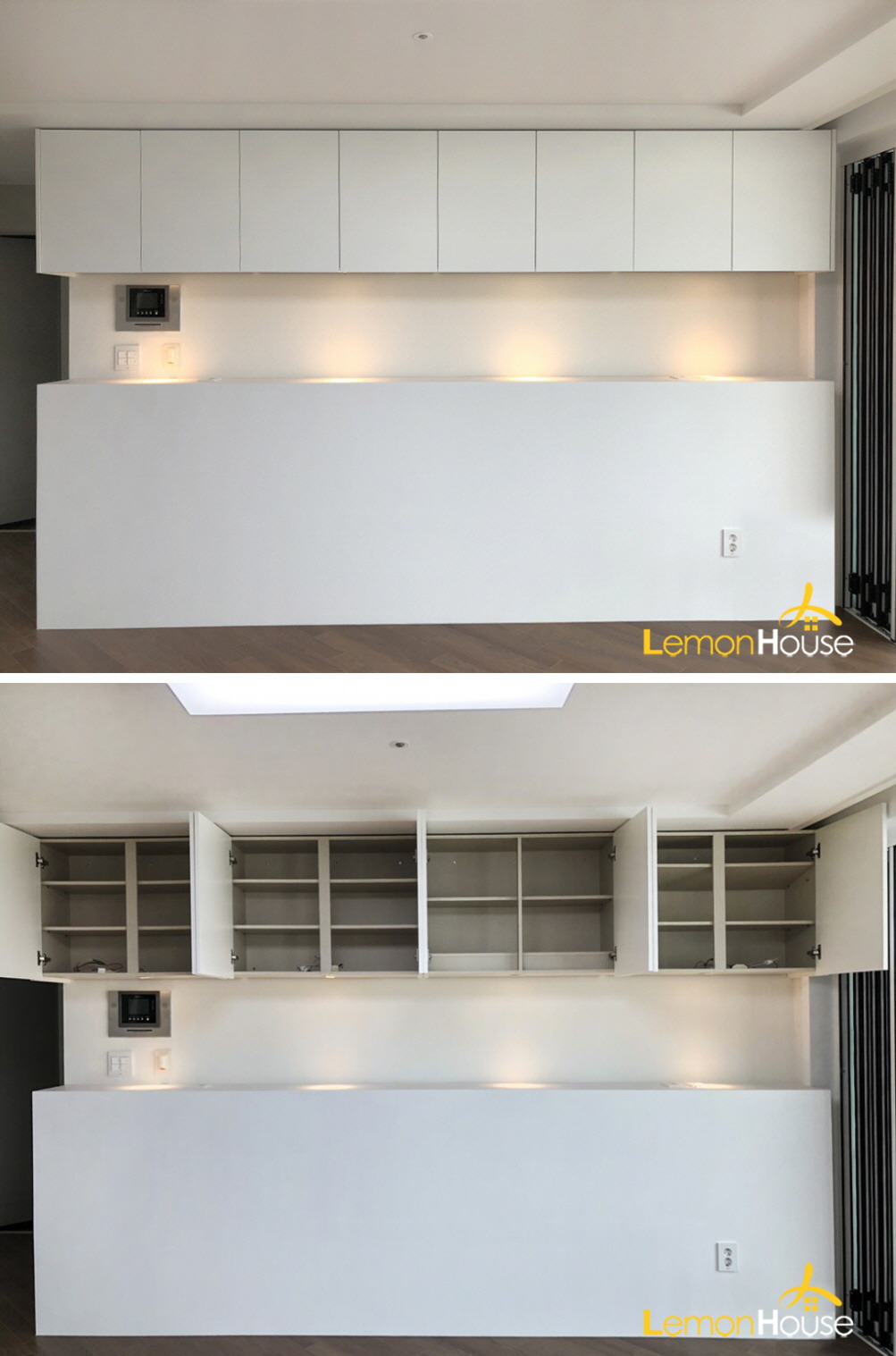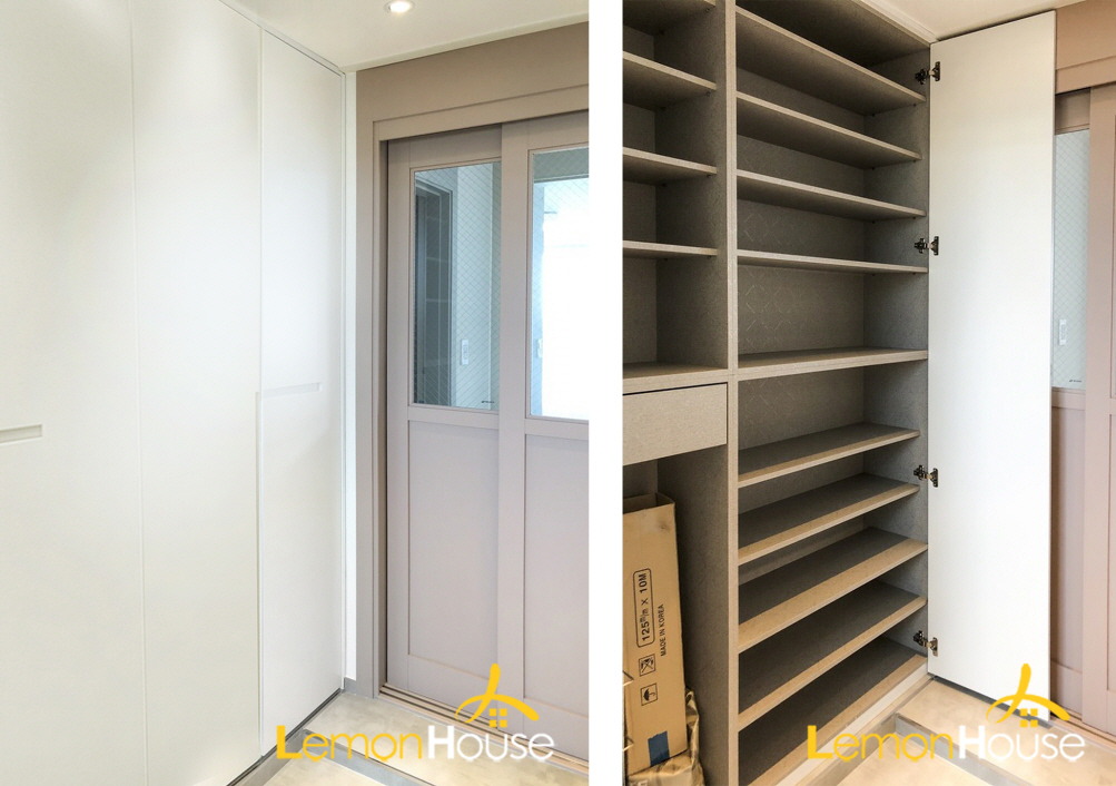 다대동 롯데캐슬몰운대의 현관인테리어는 키친앤코의 맞춤 화이트 신발장을 제작해드렸습니다.