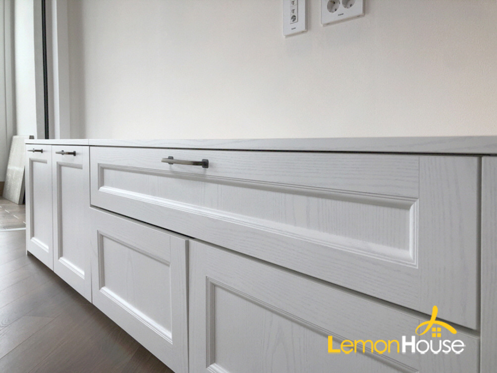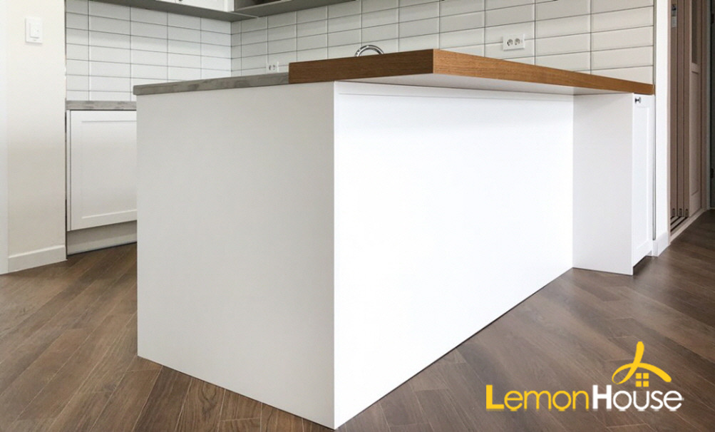 화이트 도장가구에 우드 상판을 얹어드려 기품있는 화이트 우드 컨셉을 연출해드렸어요.