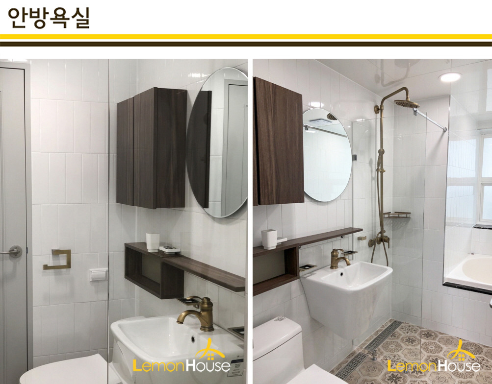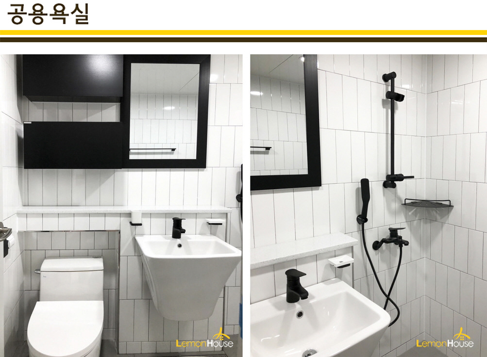 안방욕실은 우드&앤틱 컨셉이었다면 공용욕실 인테리어는 심플한 블랙&화이트로 진행해보았습니다