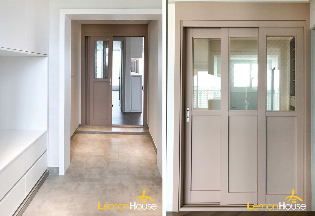 누드핑크색 3연동 중문을 설치하여 다대동 롯데캐슬몰운대의 현관인테리어를
