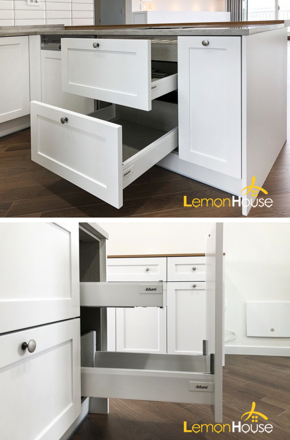다대동 다대롯데캐슬몰운대의 주방싱크대는 수입 고급 부속품인 블룸 레일을 시공해드렸습니다.