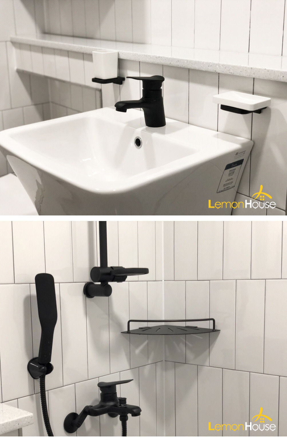 세로형으로 작업한 화이트 벽타일과 블랙 수전들.