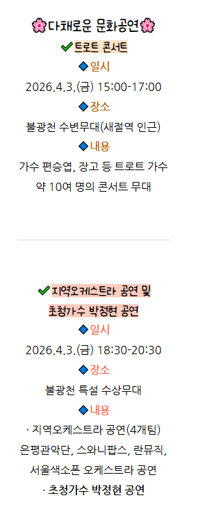 - 장소: 불광천 특설 수상무대 (서울시 은평구 응암동 122-20)