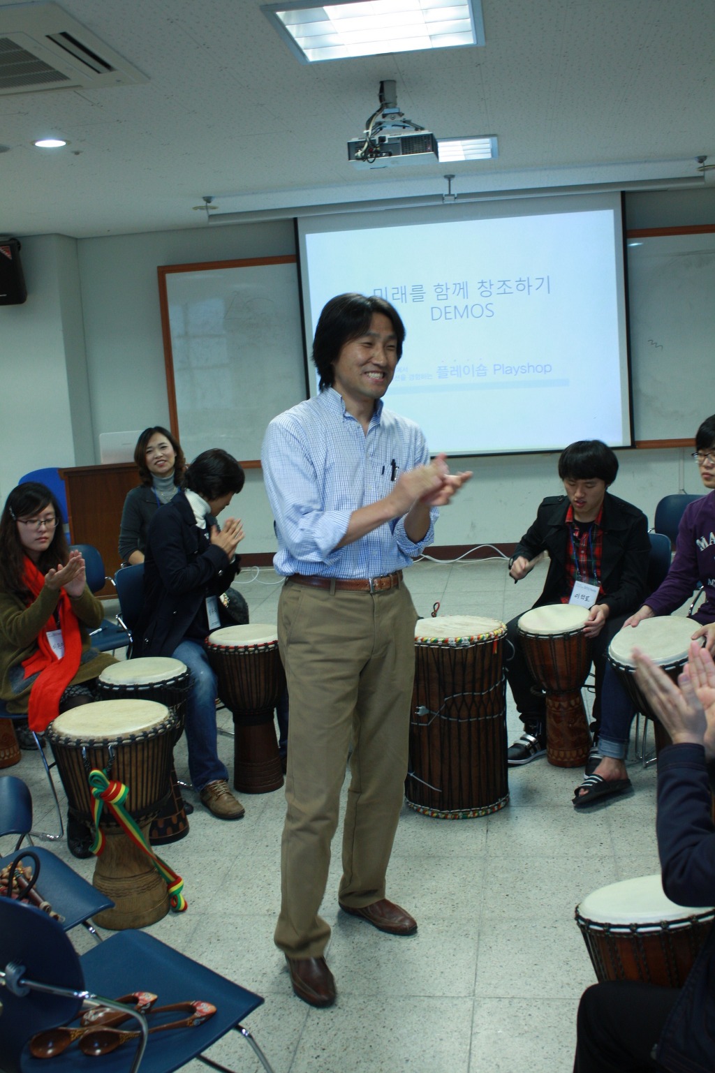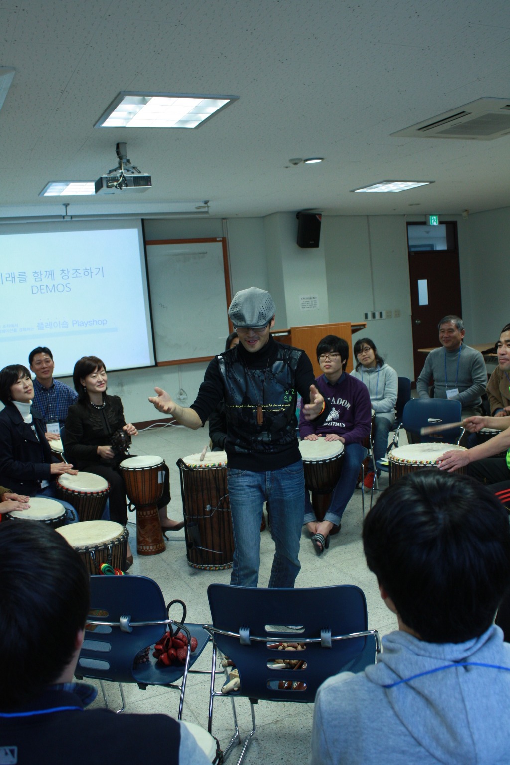 퍼실리테이션 강의 전 드럼서클의 목적을 설명하는 목원대 권선필교수