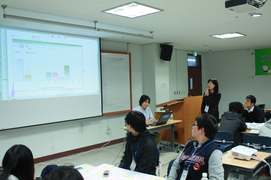 발상결과를 가지고 실시간 청중응답시스템을 사용하여 투표결과를 보고있는 참가자들