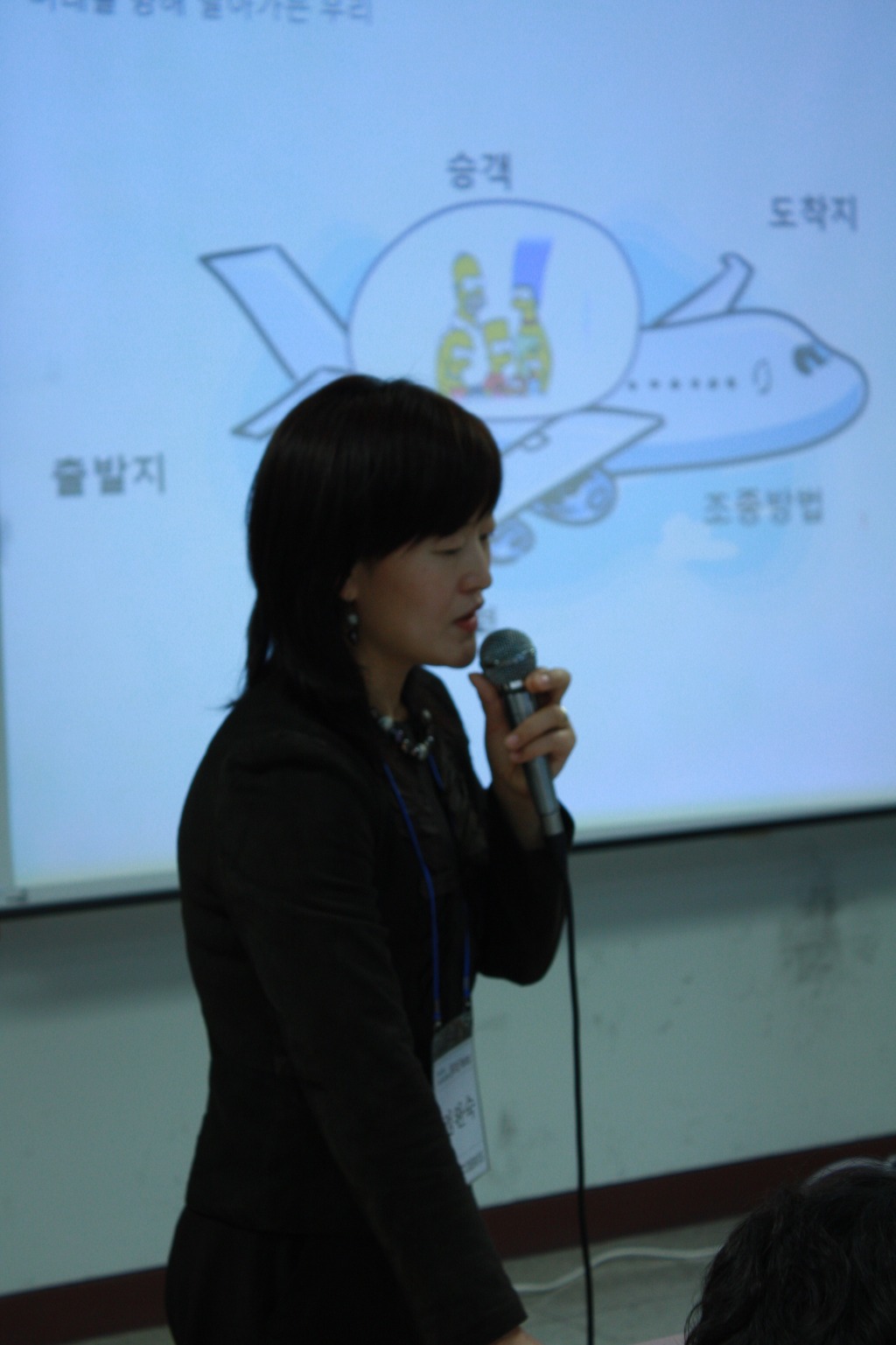 두 번째 시간에는 ‘미래를 향해 날아가는 우리 비행기’라는 주제로 디모스 정완숙 대표가 진행했다. 함께 미래를 창조하는 것을 경험하는 플레이숍, 현재 상태를 진단하고 미래를 향해 날아가는 우리 비행기 구성요소 발상과 상호 토론의 과정으로 진행되었다. 각 테이블별로 비행기 그림을 통해 출발지, 도착지, 승객, 추진력, 조종방법을 각 테이블에서 연상되는 무언가를 통해 토론과 발상, 그리고 핵심키워드 정리 과정을 거쳤다. ‘