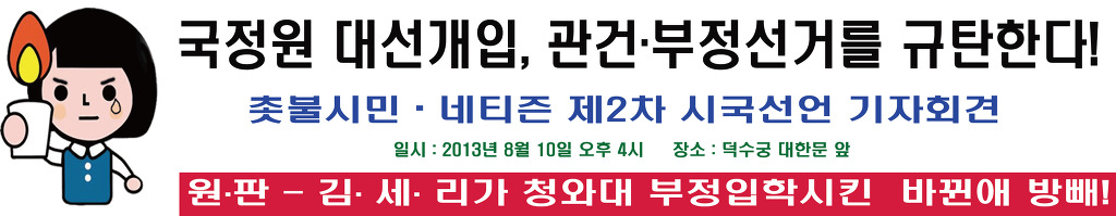그러나 부정세력들은 유권자인 국민의 염원과는 달리 엉뚱한 방향으로 국정원 사건을 몰아갔고 향후의 조짐도 매우 우려스럽기 짝이 없습니다. 전직 대통령을 끊임없이 부관참시하며 NLL 물타기를 시도했고, 심지어 자숙해야 할 국정원 스스로가 오만하게도 국가기밀을 노출시키는 위법행위를 자행했고, 독재자 박정희에 대한 인용발언 ‘귀태’를 트집 잡아 생떼를 썼고, 증거를 인멸한 국정원 댓글녀의 범죄를 밝힐 수 있는 김현과 진선미 의원을 배제시키라고 억지를 부렸고, 이명박의 증인출석을 받아들일 수 없다고 고집을 피웠고, 심지어 국정조사의 ‘비공개’로 하자는 등, 불리하다 판단되면 국정조사를 거부하며 시간 끌기에 몰두하고 있습니다.