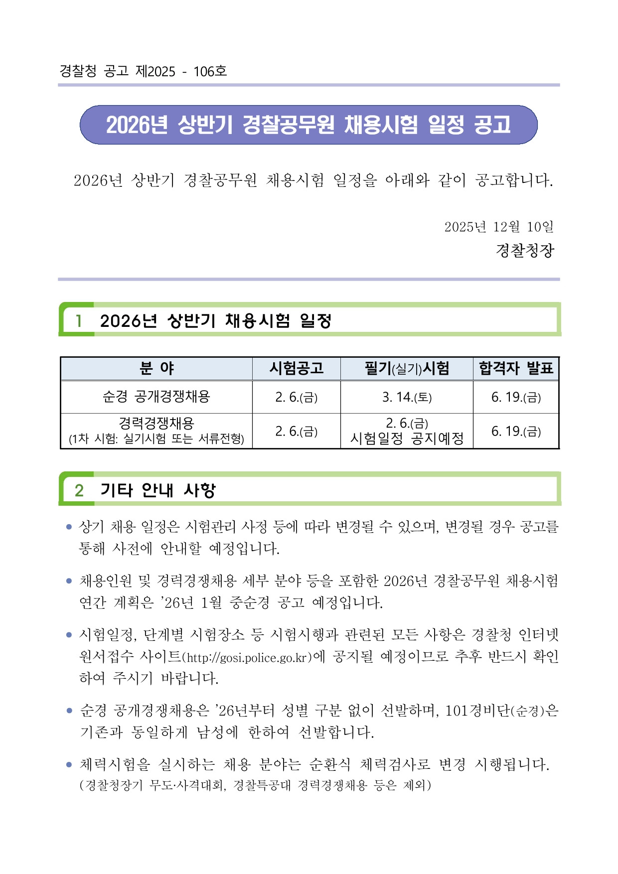 2026년 상반기 경찰공무원 채용시험 일정 공고문 작성자렉스 김과장|작성시간25.12.11|조회수2,265 목록 댓글 0 글자크기 작게가 글자크기 크게가 2026년 상반기 경찰공무원 채용시험 일정 공고문.pdf157.21KB 첨부파일첨부된 파일이 2개 있습니다. jpg 파일 2026년 상반기 경찰공무원 채용시험 일정 공고문.jpg 다운로드 pdf 파일 2026년 상반기 경찰공무원 채용시험 일정 공고문.pdf 다운로드 다음검색 현재 게시글 추가 기능 열기 북마크 공유하기 신고 센터로 신고 댓글 댓글 0 댓글쓰기 답글쓰기 댓글 리스트